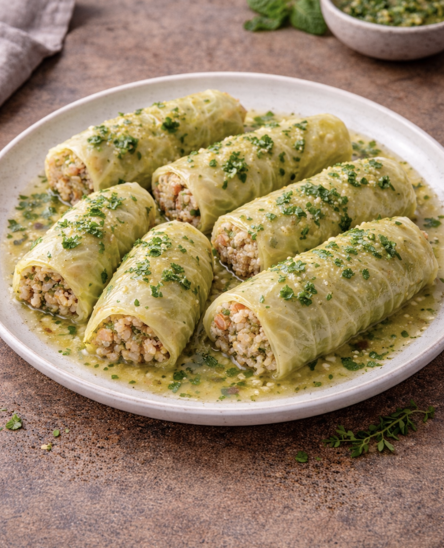 Zart Gefüllter Weißkohl mit aromatischer Reisfüllung, frischer Petersilie, Tomaten und feinen Gewürzen. Durch das vorherige Einweichen des Reises gart die Füllung gleichmäßig und bleibt besonders locker.