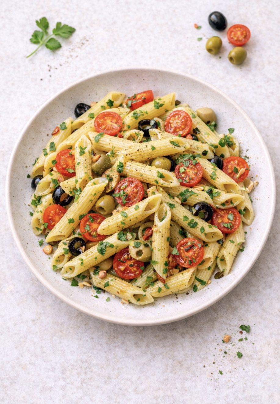 Diese mediterrane Pasta kombiniert aromatische Tomaten mit würzigen Oliven und Olivenöl. Das Gericht ist einfach, schnell zubereitet und bringt den typischen Geschmack der italienischen Küche auf den Teller. Frische Kräuter sorgen zusätzlich für ein besonders angenehmes Aroma.