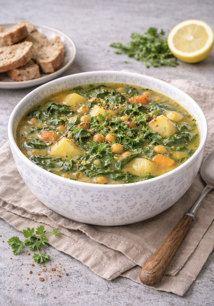Spinat-Kichererbsen-Suppe ist ein herzhaftes und nährstoffreiches Gericht, das perfekt für eine gesunde und ausgewogene Ernährung geeignet ist. Die Kombination aus proteinreichen Kichererbsen, frischem Spinat und aromatischen Gewürzen wie Kreuzkümmel und Kurkuma sorgt für einen intensiven Geschmack und eine angenehm wärmende Mahlzeit. Diese Suppe ist einfach zuzubereiten, sättigend und ideal für jeden Tag – ob als leichtes Mittagessen oder als stärkende Abendmahlzeit.